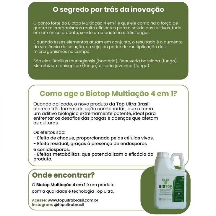 • Tripla Forma de Ação: O BIOTOP Multi-Ação 4 em 1 oferece uma abordagem completa, com células vivas, conidiosporos, endosporos e metabólitos, proporcionando um controle prolongado e altamente eficaz.